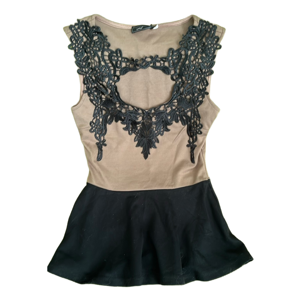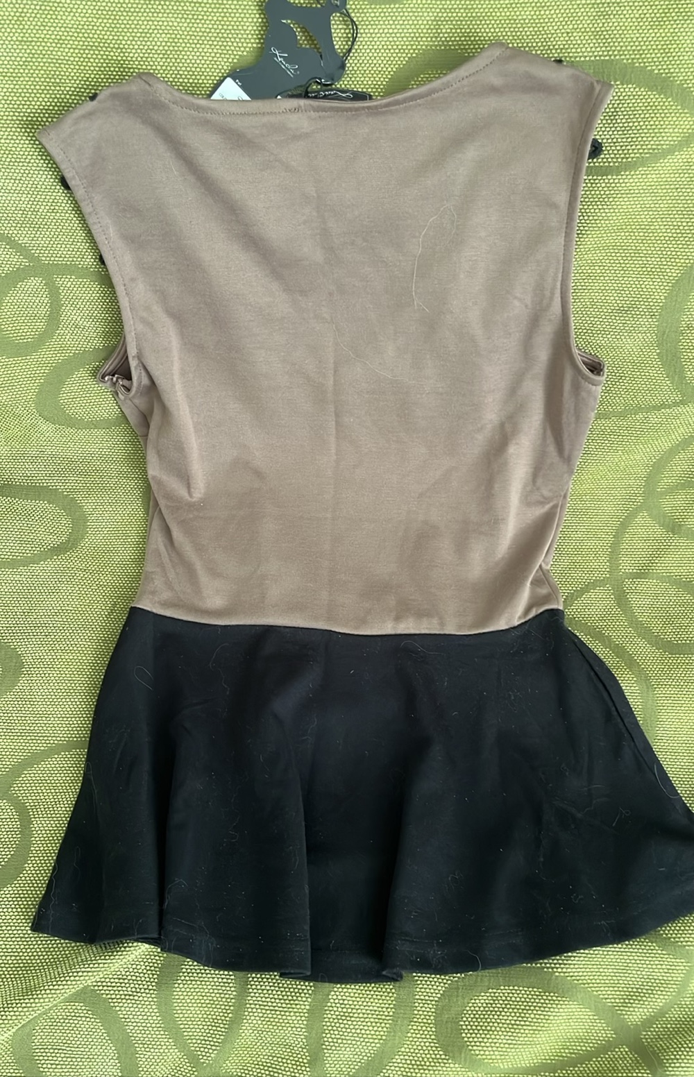 Beige sleeveless top with black lace decoration and cut hem. New, price tag attached. Size label M corresponds to size S