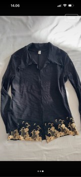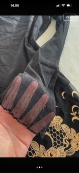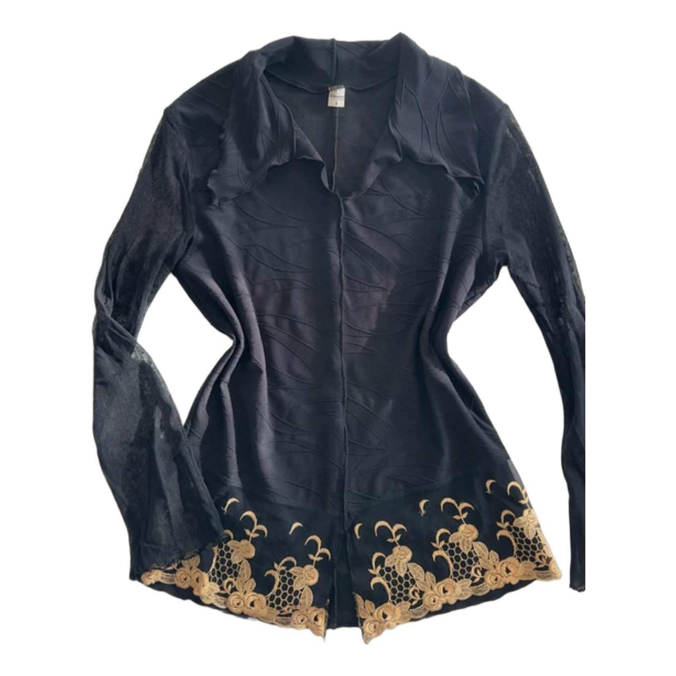 Black sheer mesh long-sleeved top with textured fabric and gold embroidery at the hem. Features a collared neckline.