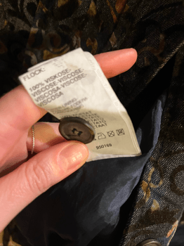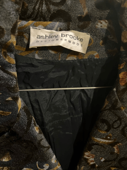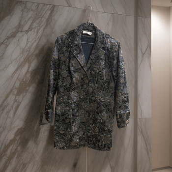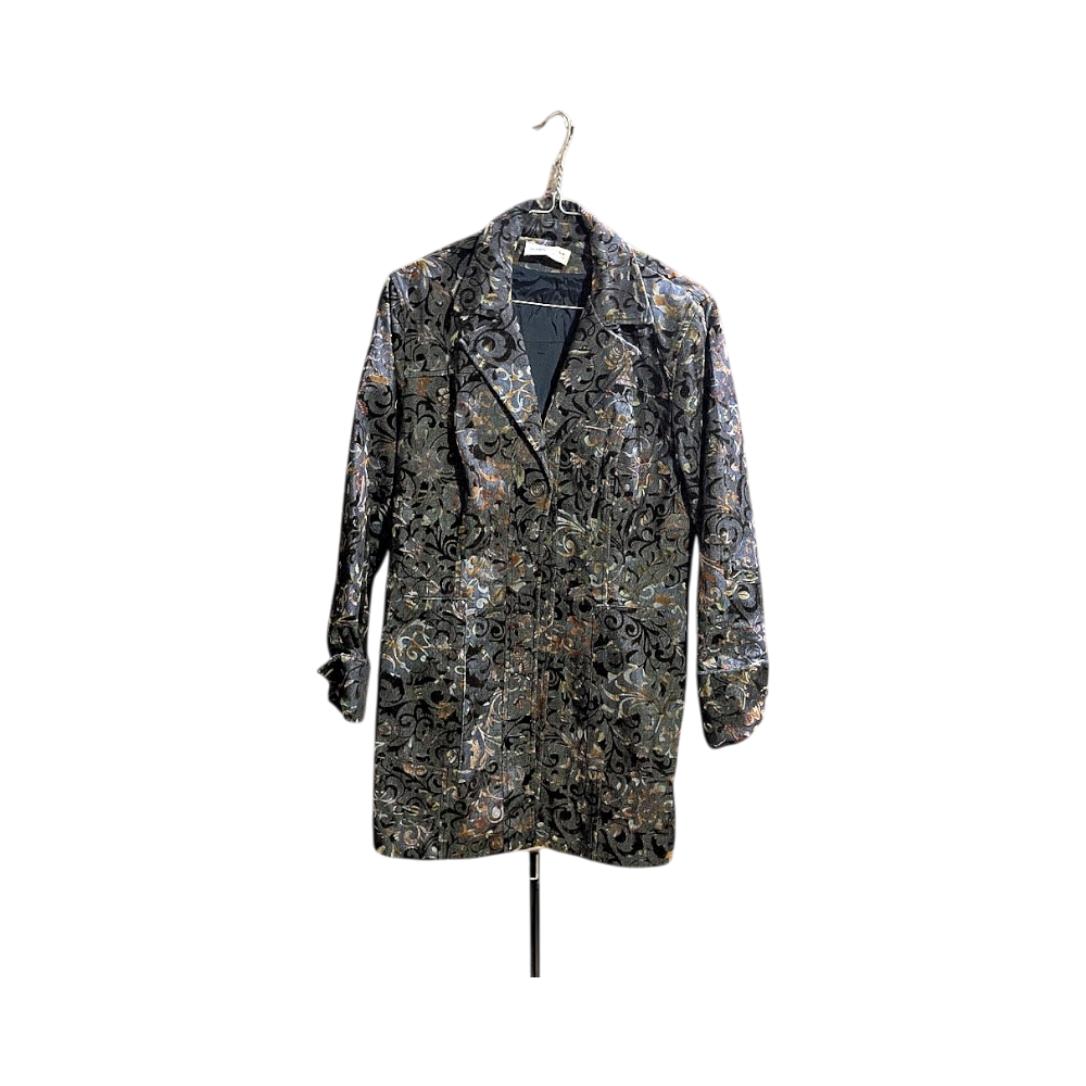 Coat featuring a multicolor design with a floral pattern. Includes a lapel collar and two front pockets.
