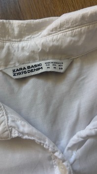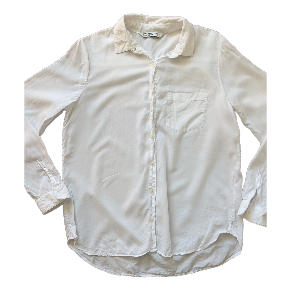 White Zara Basic shirt with long sleeves, buttoned cuffs, and a chest pocket. Size M.