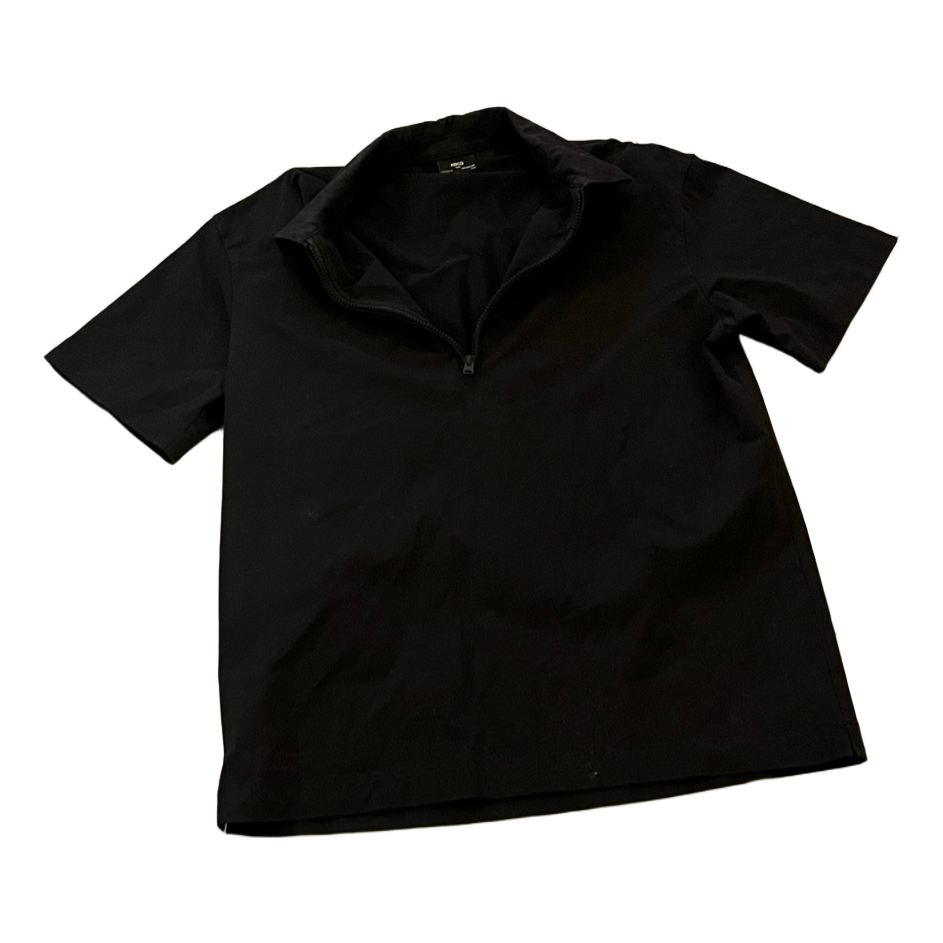 Black short-sleeved shirt with a short zipper at the neckline. Size M.