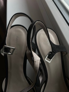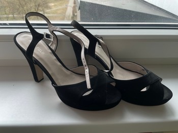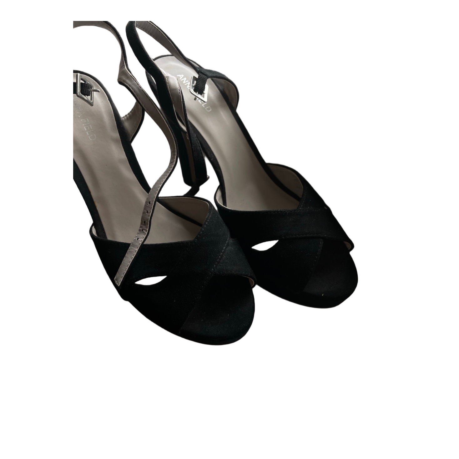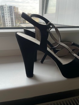 Elegant black heeled sandals with a slingback strap and buckle closure. Featuring a platform sole and a comfortable block heel.