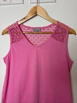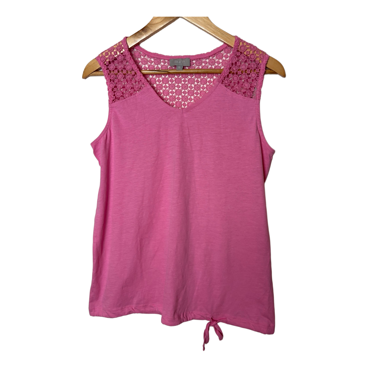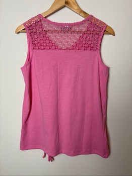 Pink sleeveless top with decorative lace panels at the shoulders and back. Features a V-neckline and a tie detail at the hem. Size S.