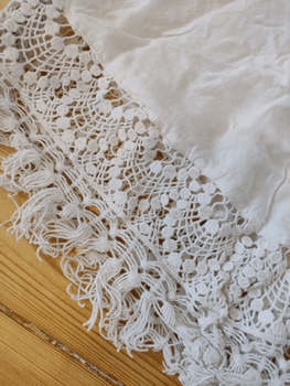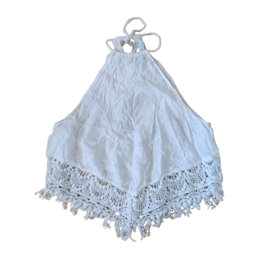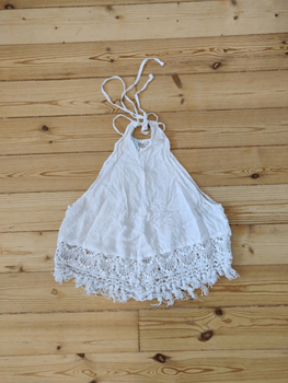 Light summer top, tied with strings around the neck, hem with lace decoration.