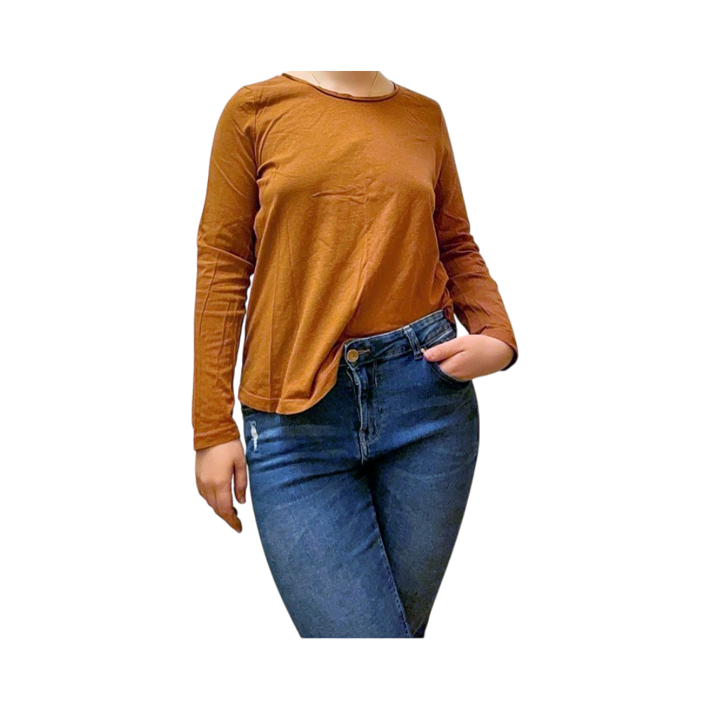 Orange/brown long-sleeved shirt, simple and comfortable. Shown on size S.