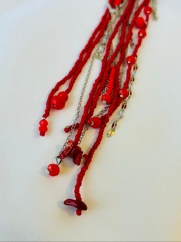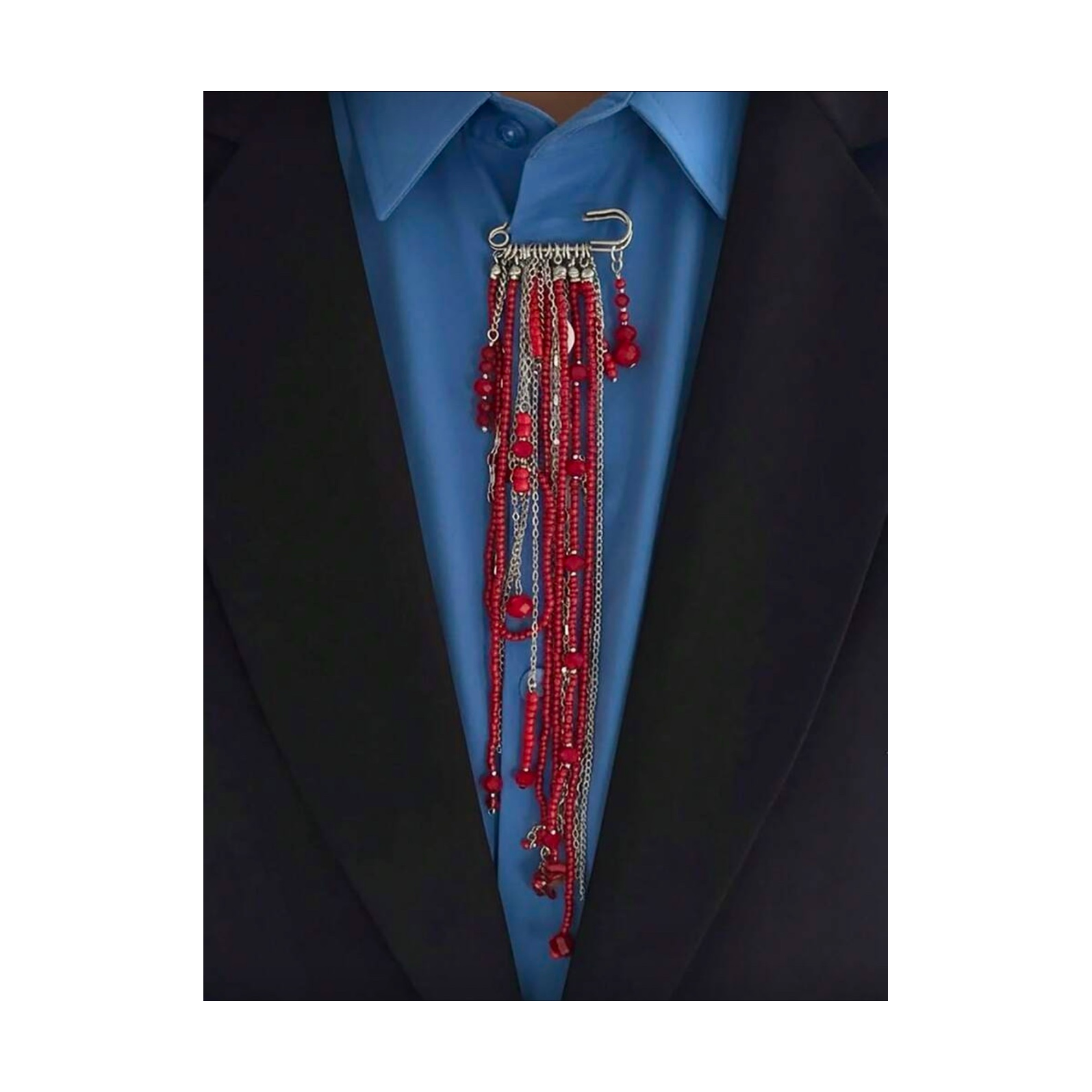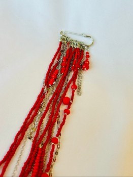 Brooch featuring layered red beads and silver-toned chains suspended from a large safety pin.