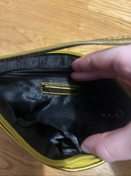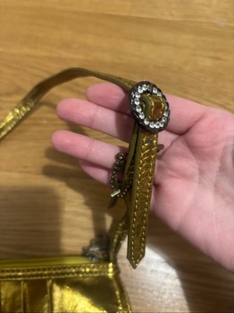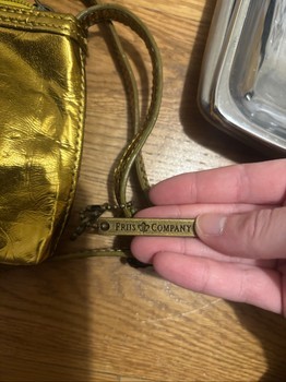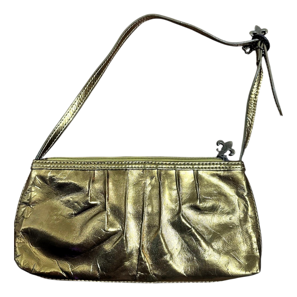 Friis & Company's golden shoulder bag. Zipper closure and one shoulder strap. The shoulder strap has a buckle detail.