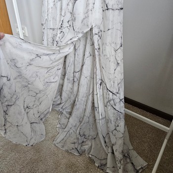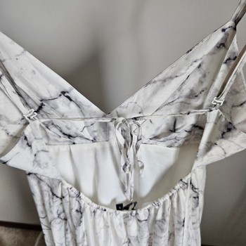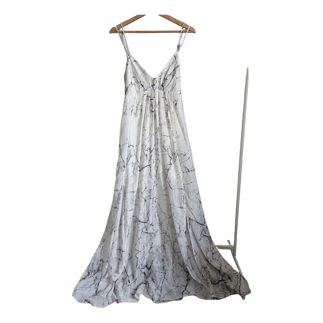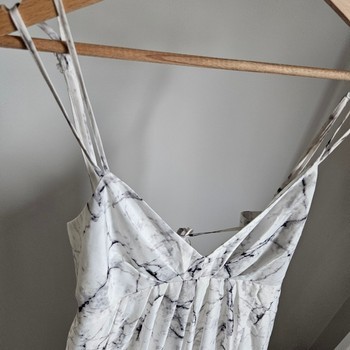 Stunning white marble print maxi dress in very good condition. Super flattering and eye-catching style with flowing full-length skirt, deep V neckline and dramatic open back detail.