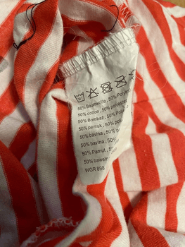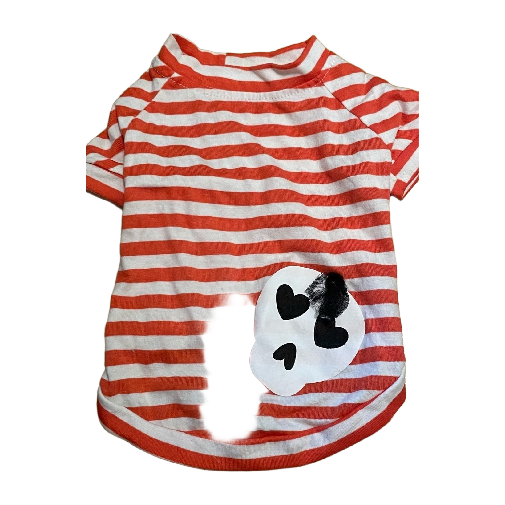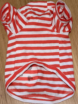 Dog shirt red white skull 50% cotton 50% polyester. Condition good. There are small stains on the left belly; I haven't tried to remove them. Chest 36 cm. Back length 29 cm.