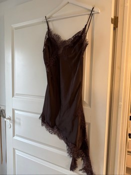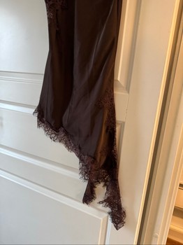 Brown satin dress with lace details and asymmetrical hem. Adjustable straps.