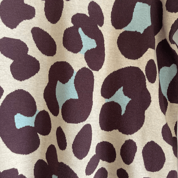 Features an abstract floral pattern in beige brown plum and light blue tones. Round neckline, three quarter sleeves and a flattering slim fit. Soft stretchy and comfortable fabric.