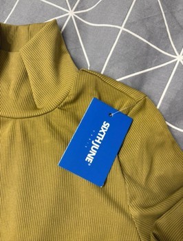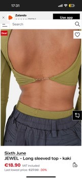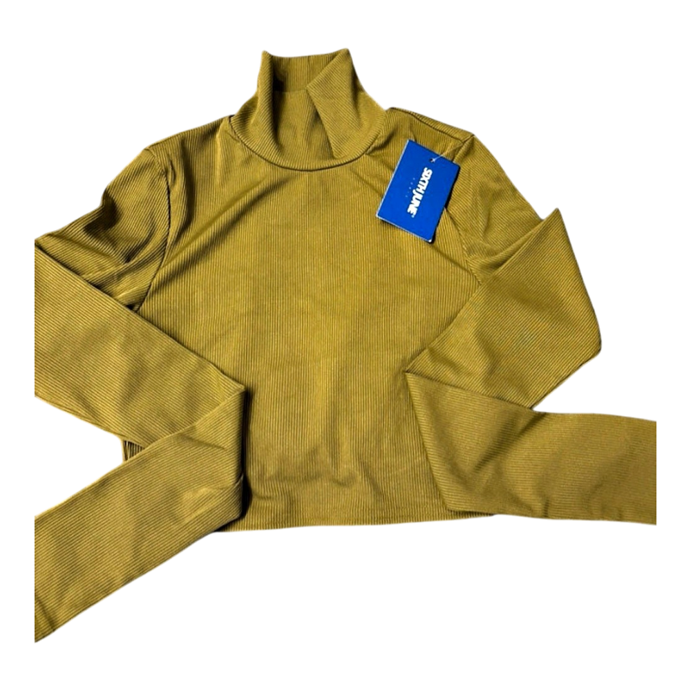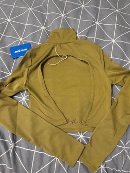 Khaki ribbed long-sleeved top with a turtleneck. Features an open back design with a small metal clasp. Item is new with tags.