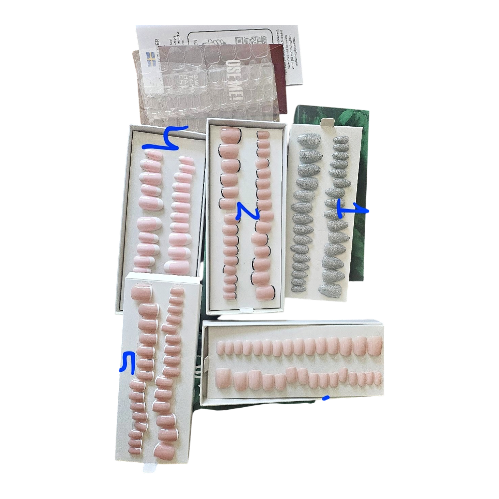 To choose from, collection of various artificial press-on nails in different styles including glitter, french tip, and solid nude finishes, includes sticky tabs. Brand: switch nails. Price 15€ per set.