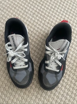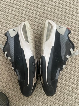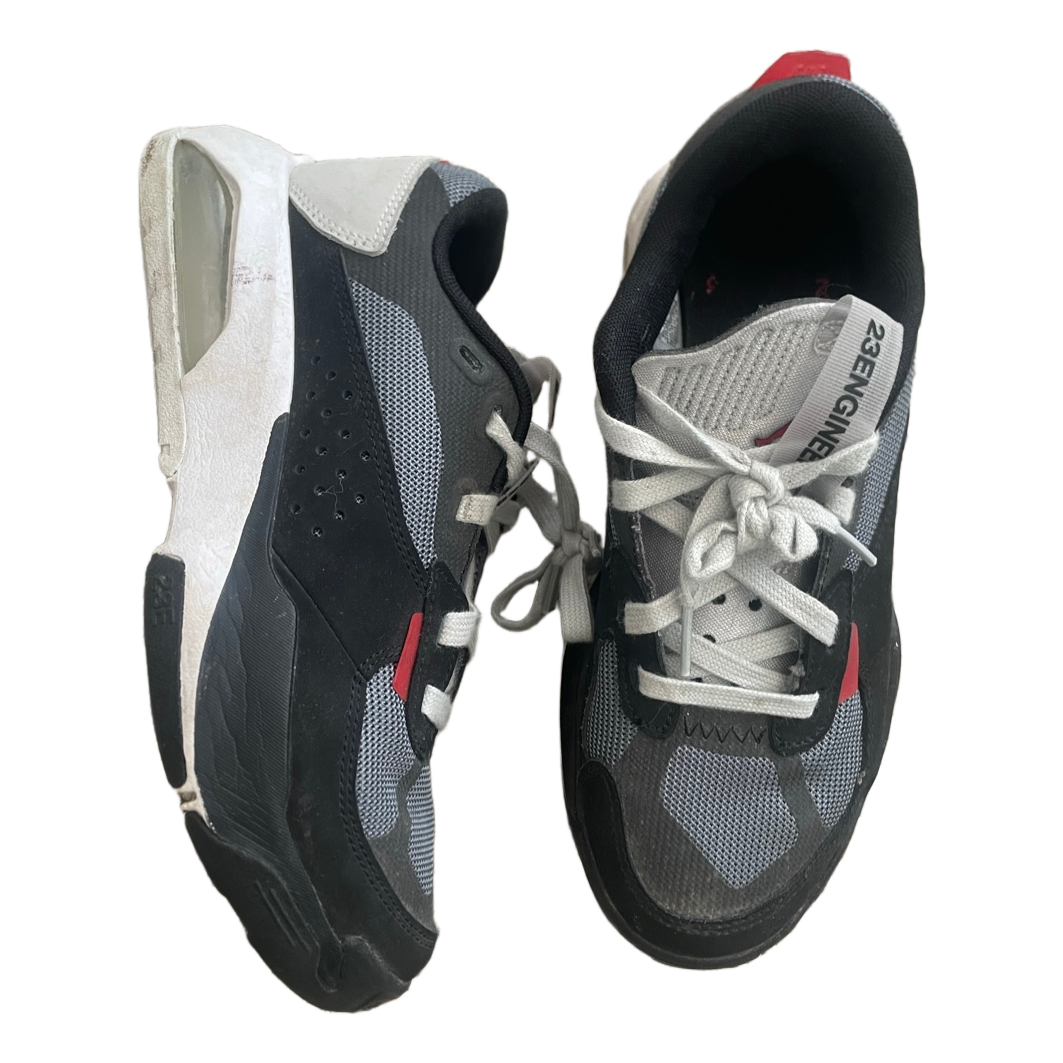 Lightly used, very tidy Nike Jordan air 200E. The only flaw: the red trim at the back was torn and cut neatly (sixth photo) — does not affect use in any way. The gray parts are reflectors. Size marking 36.5. Insoles 23.5 which means roomy fit. Price is fixed, new price 200€