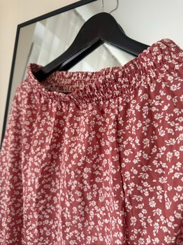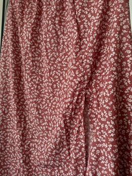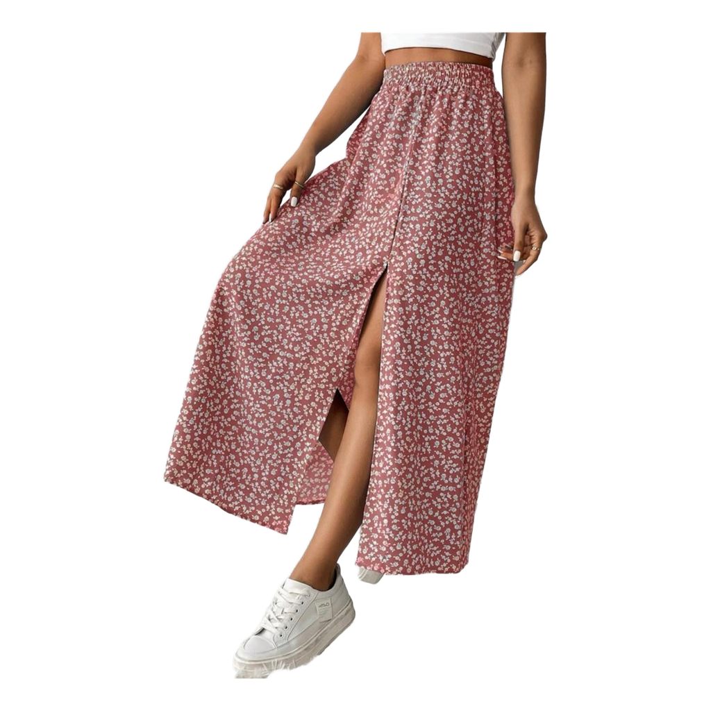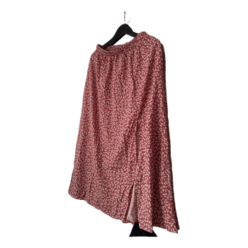 Pink skirt with a floral pattern. Has an elastic waistband and a front slit.