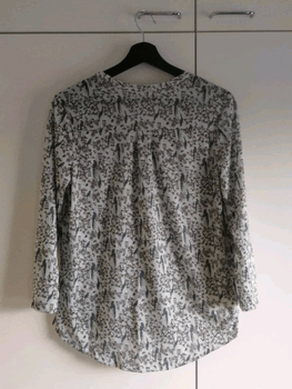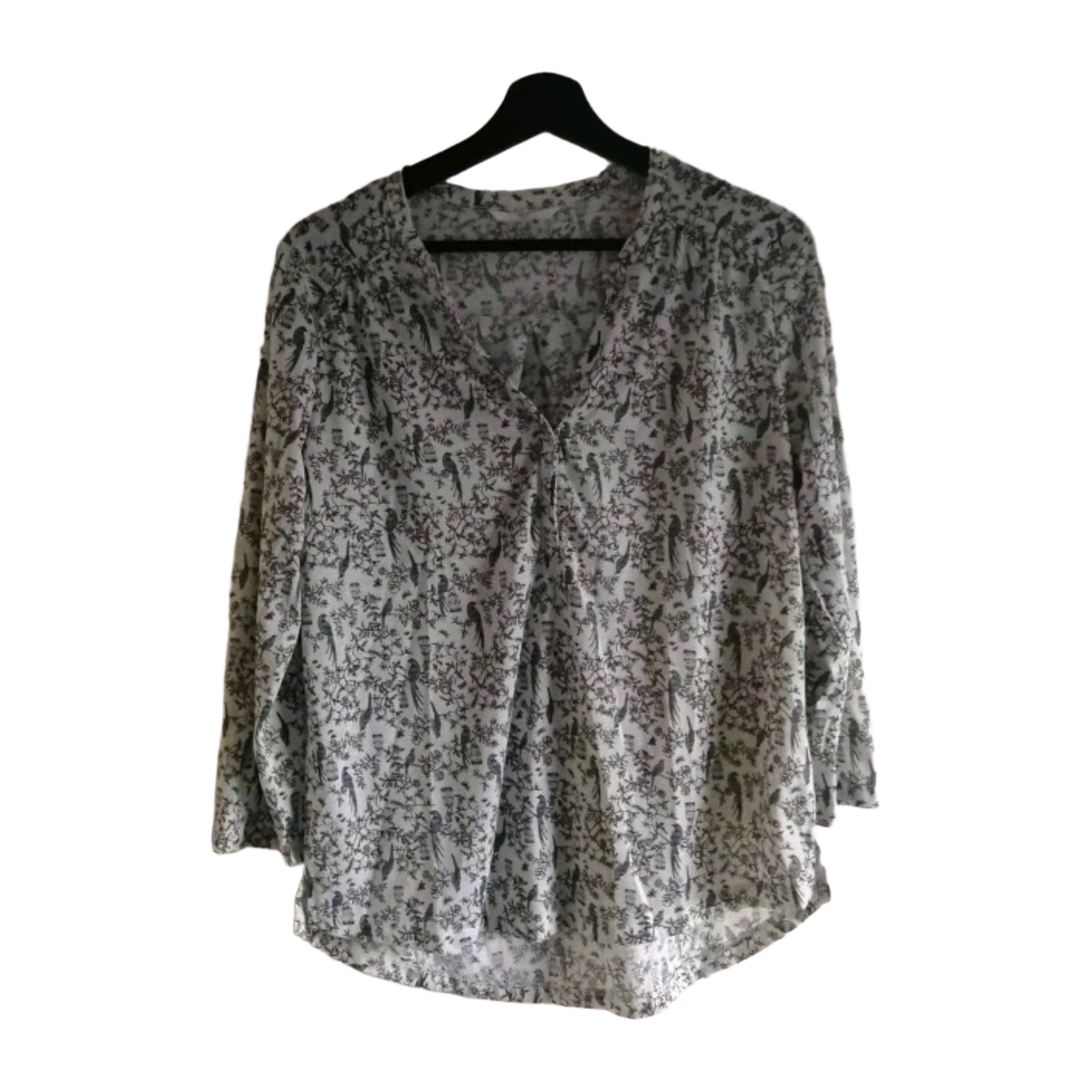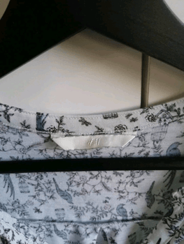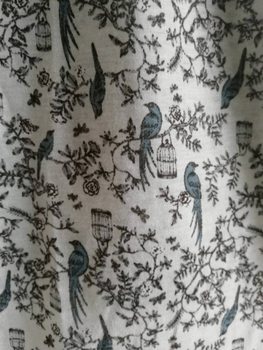 Light blue shirt, with a print of birds, cages and rose branches. Soft to wear. Thin material, but not see-through. Material unknown (label cut), but I would guess a viscose blend.