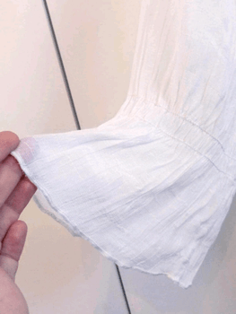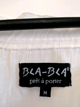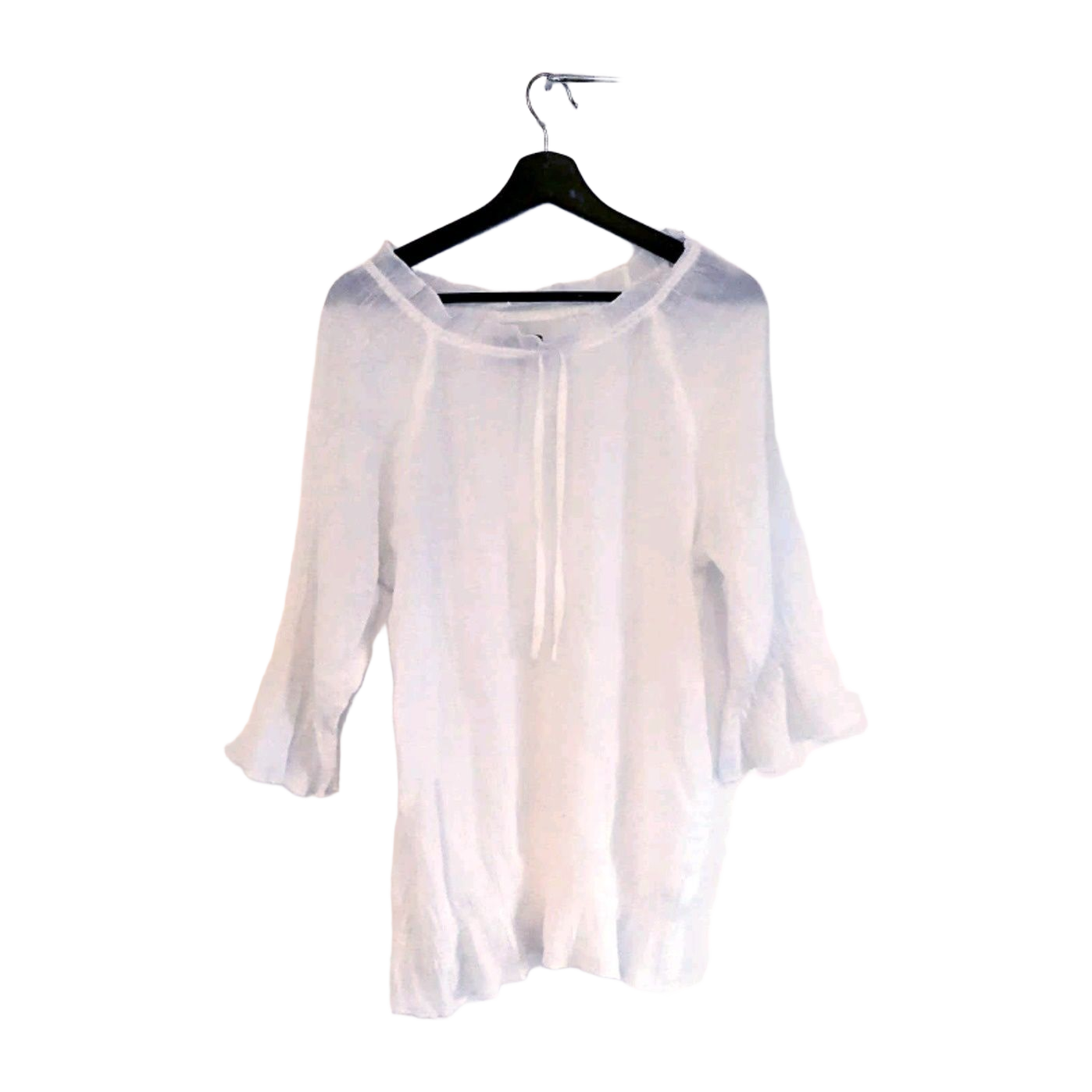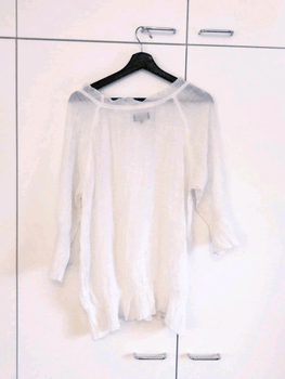 White, translucent blouse. Looks really nice with a skirt (hem tucked under the skirt). Lightweight to wear. Only tried on (never worn), so in excellent condition. Free shipping with code JJ1591.