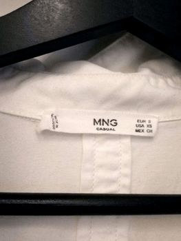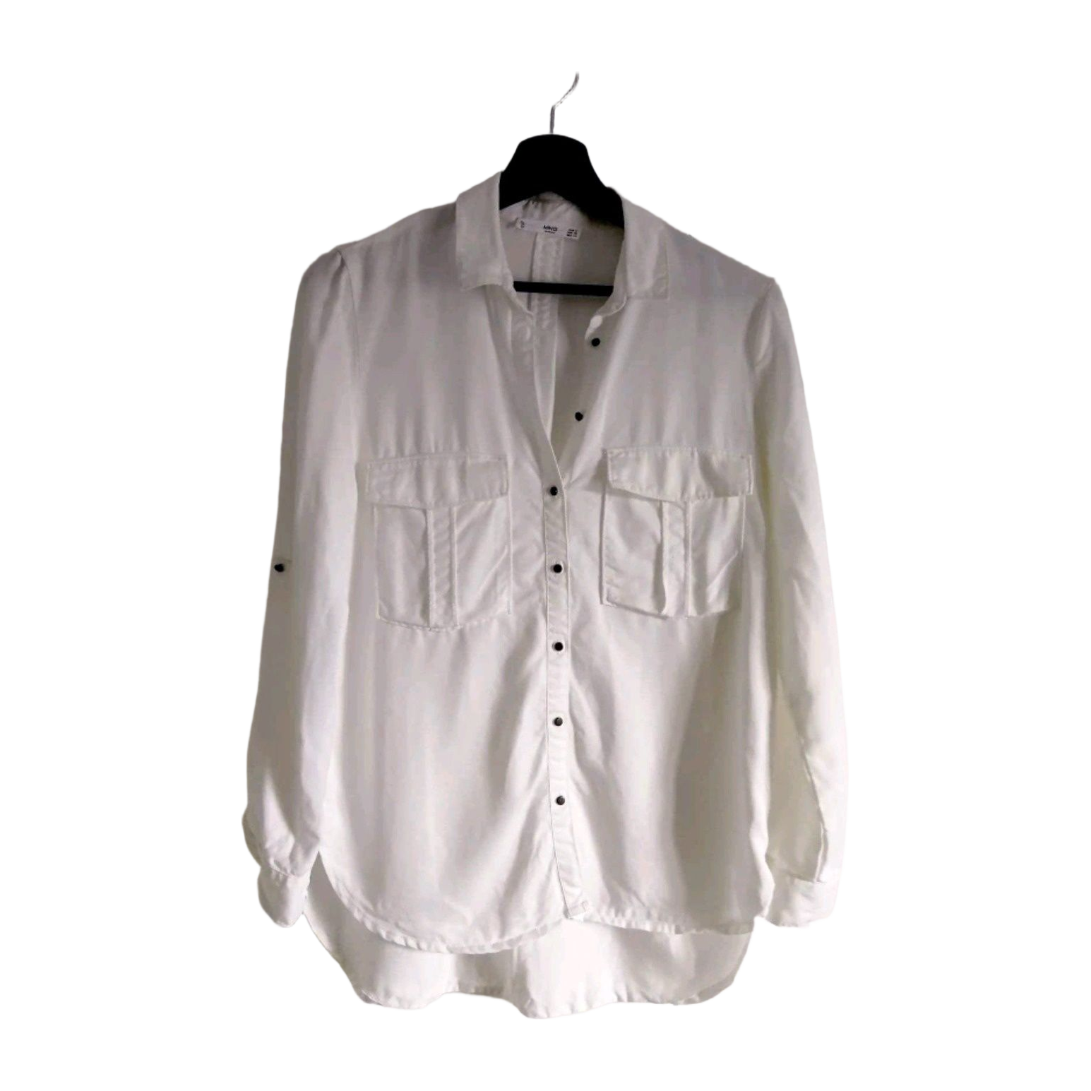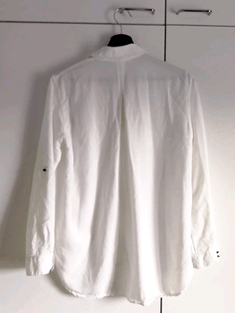 Mango white blouse. Thick, high-quality-feeling fabric. Long model. Sleeves can be rolled up and fastened up if desired. Not used at all (except for trying on) but the material label cut (I recall it being cotton/lyocell). Free shipping with code JJ1591.
