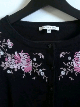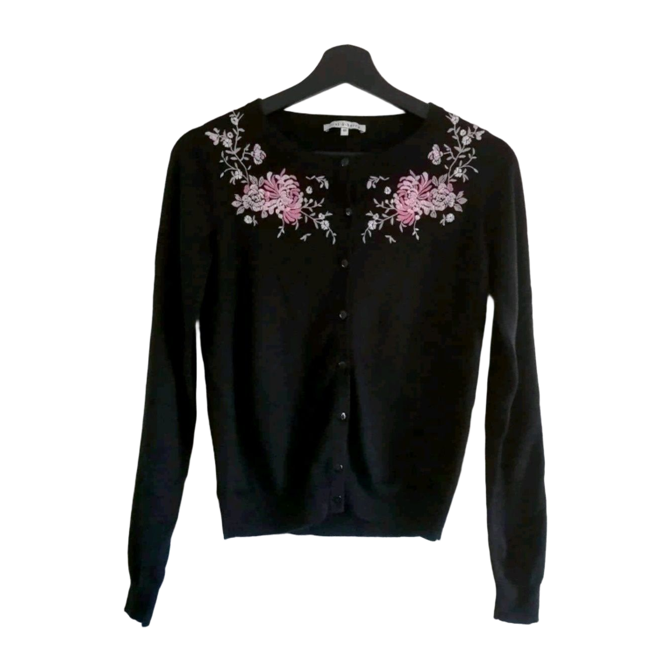 Very pretty black cardigan made of soft and pleasant material. Black buttons, plant-themed embroidery around the collar. Excellent condition, used a couple of times. Free delivery with code JJ1591 🌺