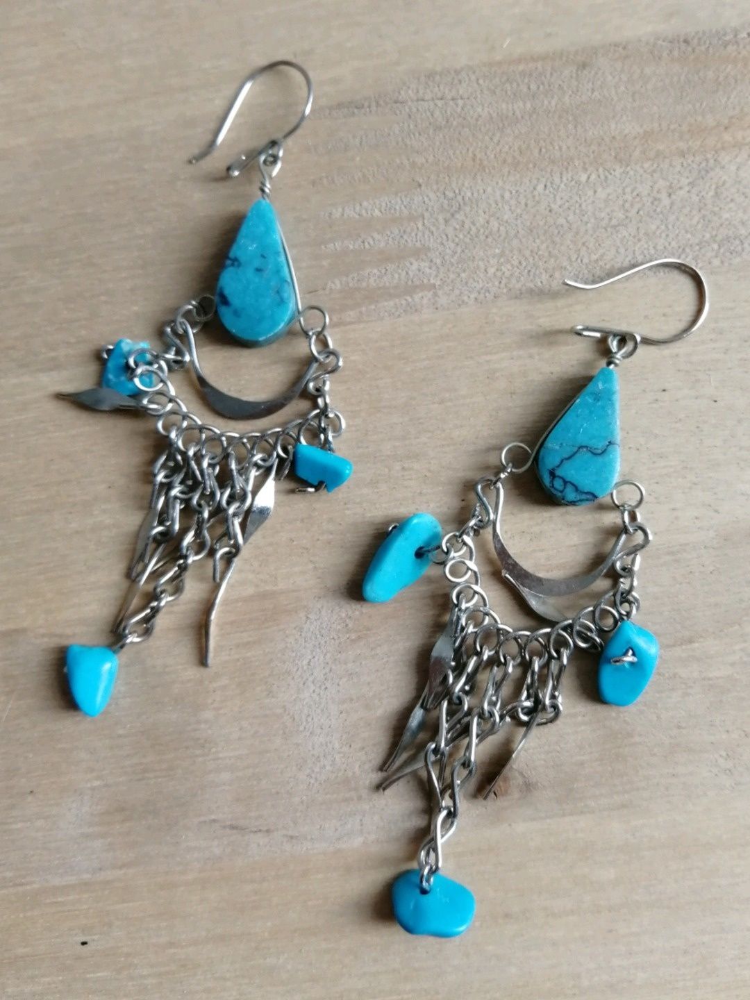 Rather large, hanging earrings, turquoise stone and silver. Have never been used, so in completely like-new condition. Length of hanging part approx. 6.5 cm.