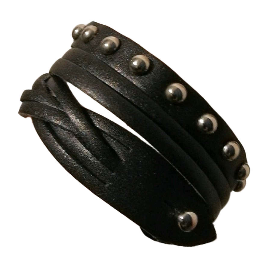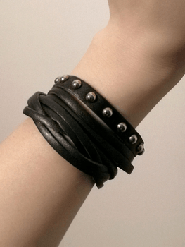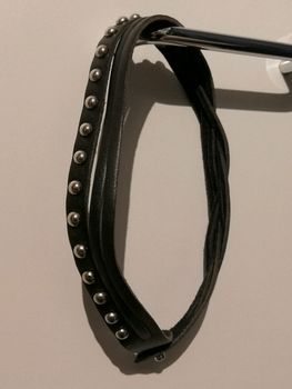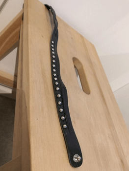 Black leather wristband with silver-coloured studs. Can, if desired, be worn as a necklace as well. Total length 38 cm. My wrist about 14.8 cm and neck about 32.5 cm, fits me slightly loosely. In excellent condition.