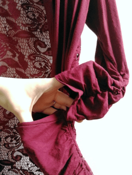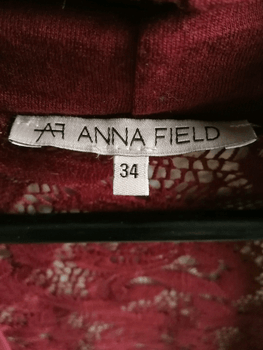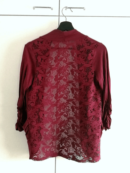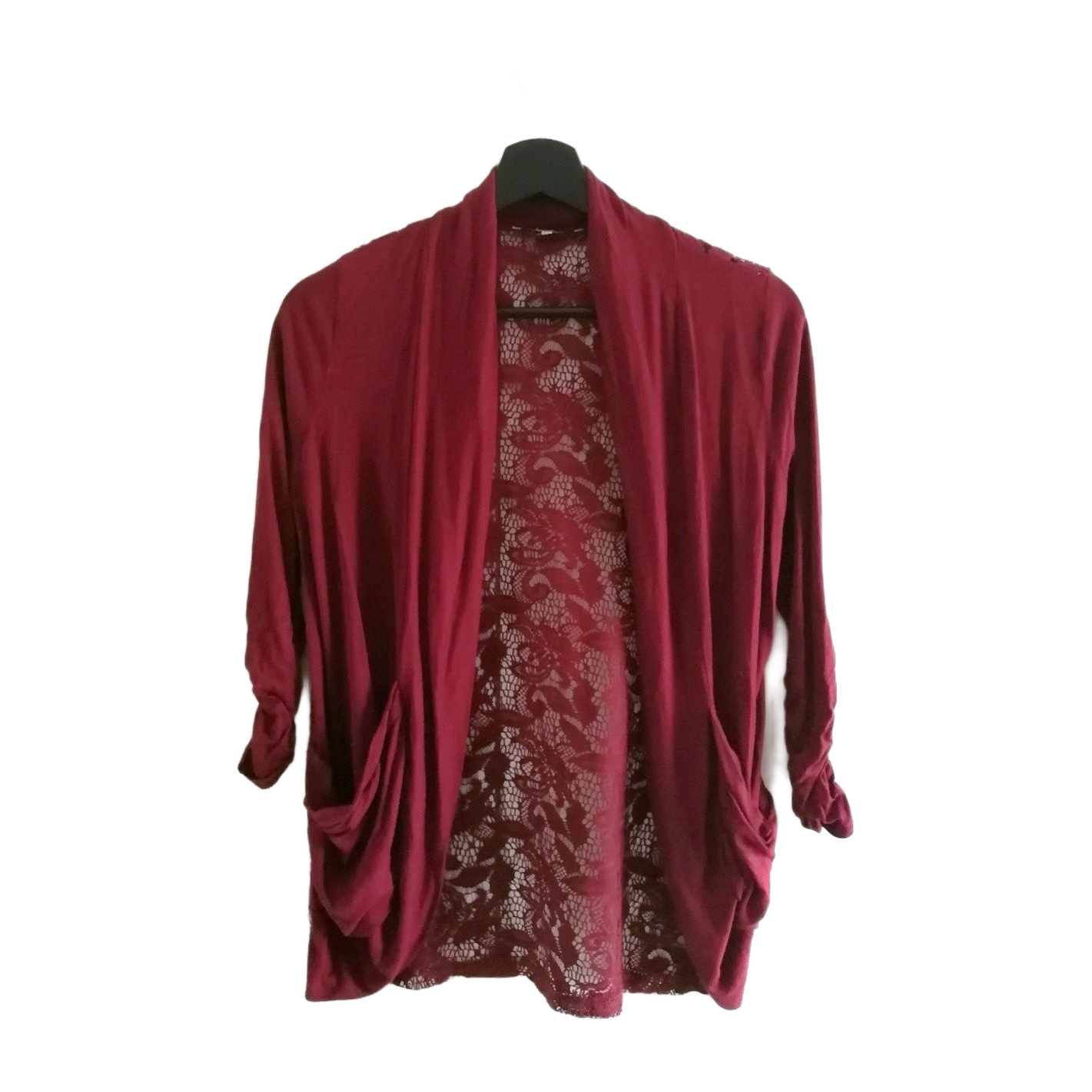 Anna Field wine-colored (Bordeaux), romantic cardigan in size 34. Back lace, open at the front. Ruching at the sides and sleeves, falls flattering the body's shapes. Comfortable to wear, probably a cotton blend, but does not wrinkle badly. Also pockets! Bought from Zalando, no longer sold there.