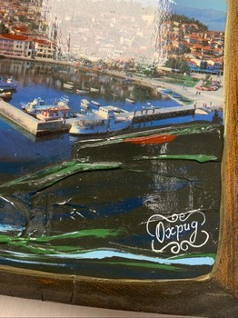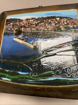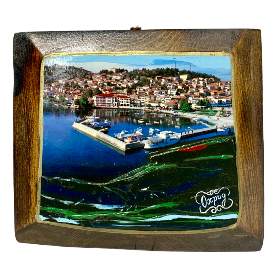 Small decorative wooden wall plaque featuring a painted landscape scene of Ohrid. Includes a hanging hook on the back.