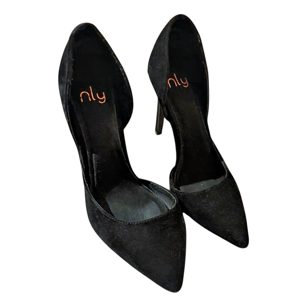 Black pointed high heels with a d'Orsay cut. Features an orange 'nly' logo on the insole.