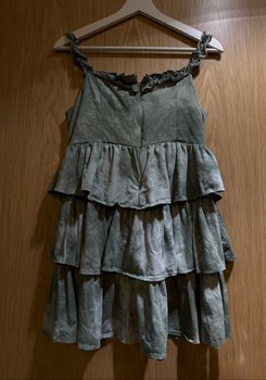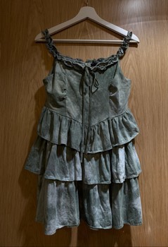Green dress featuring tiered ruffles and a tie-up detail on the front. Features a back zipper closure. Size L.