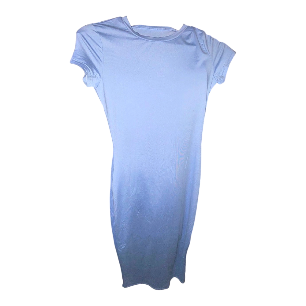 Light blue midi dress. Short-sleeved, figure-hugging model.
