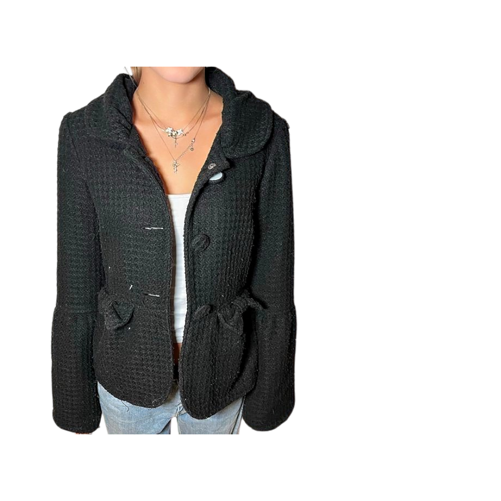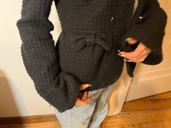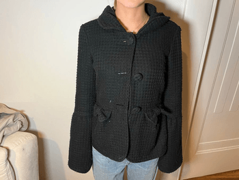 The long-sleeved coat has large buttons and a tie at the waist. The collar has soft fabric and loose sleeves.