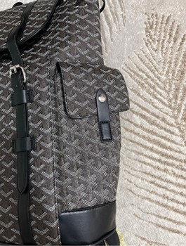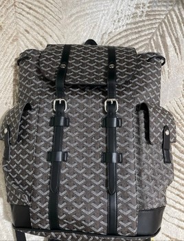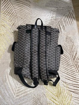 Goyard backpack in grey printed canvas with black leather trim and silver-tone hardware. Featuring buckled straps and side pockets.
