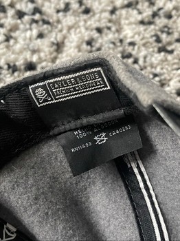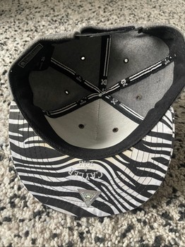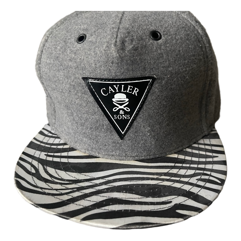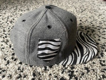 Grey cap, which has a zebra-patterned brim. Made of cotton.