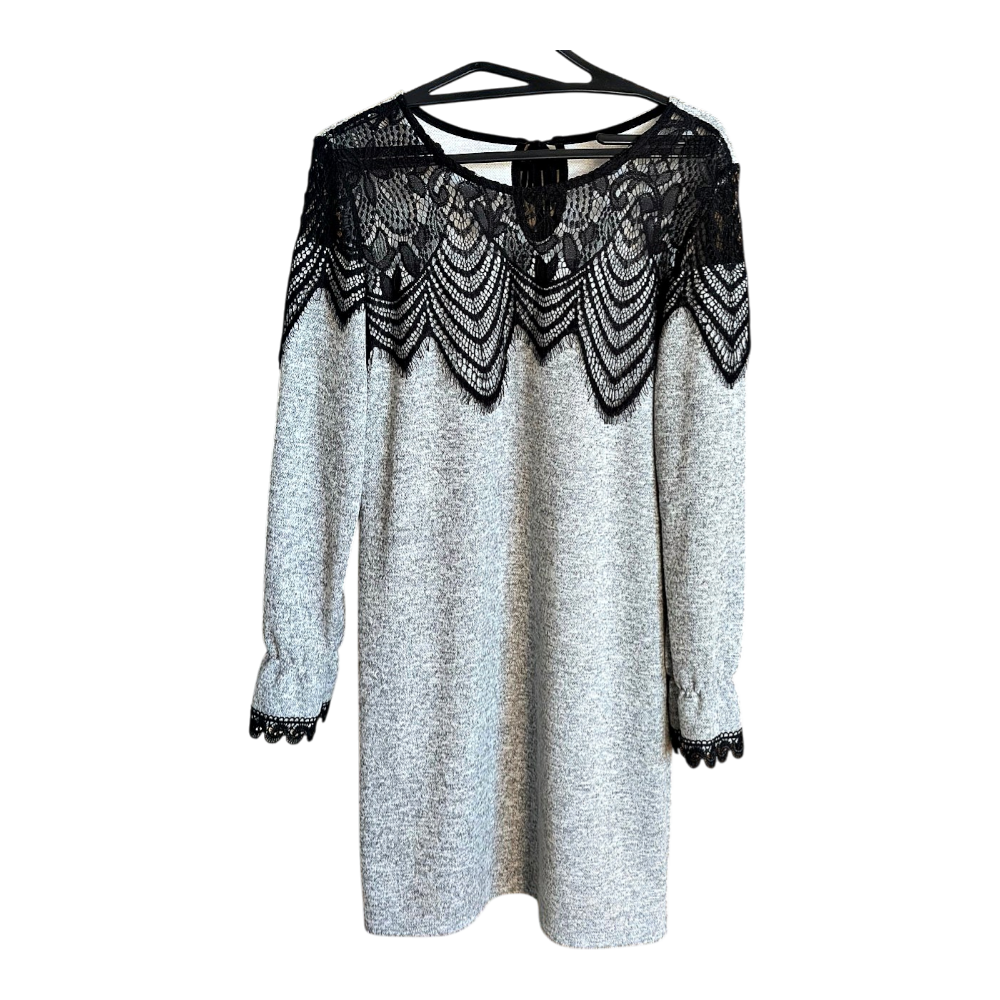 Grey dress with black lace detailing on the neckline and cuffs. Features long sleeves and a tie detail at the back.