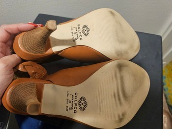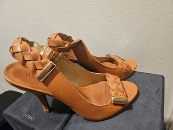Brown leather slingback heels with a braided strap detail and gold-tone hardware. Size 38.
