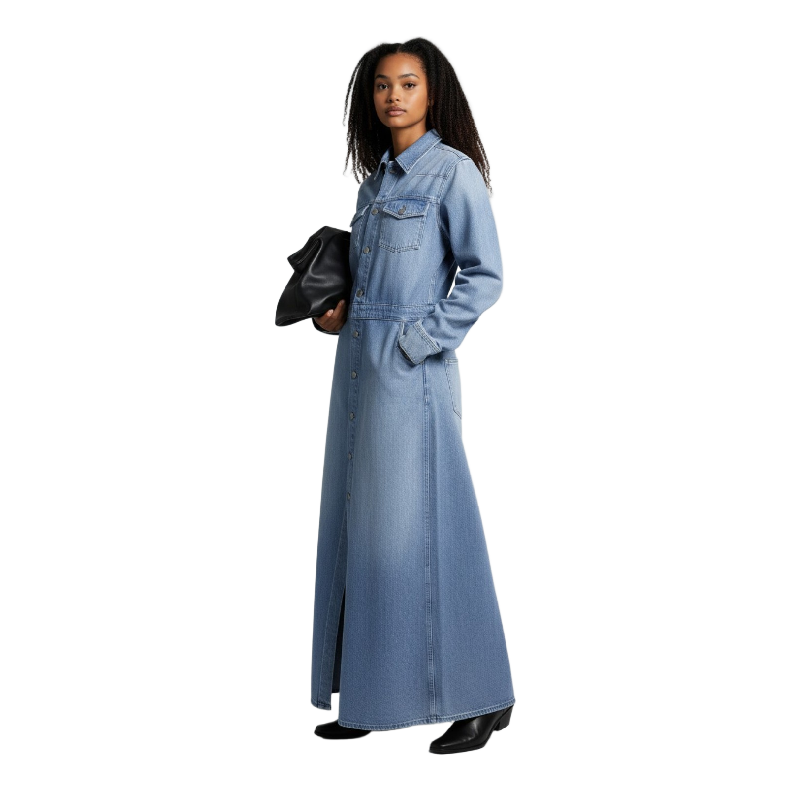 Button-down long-sleeved denim maxi dress. Features a collared neckline and chest pockets.