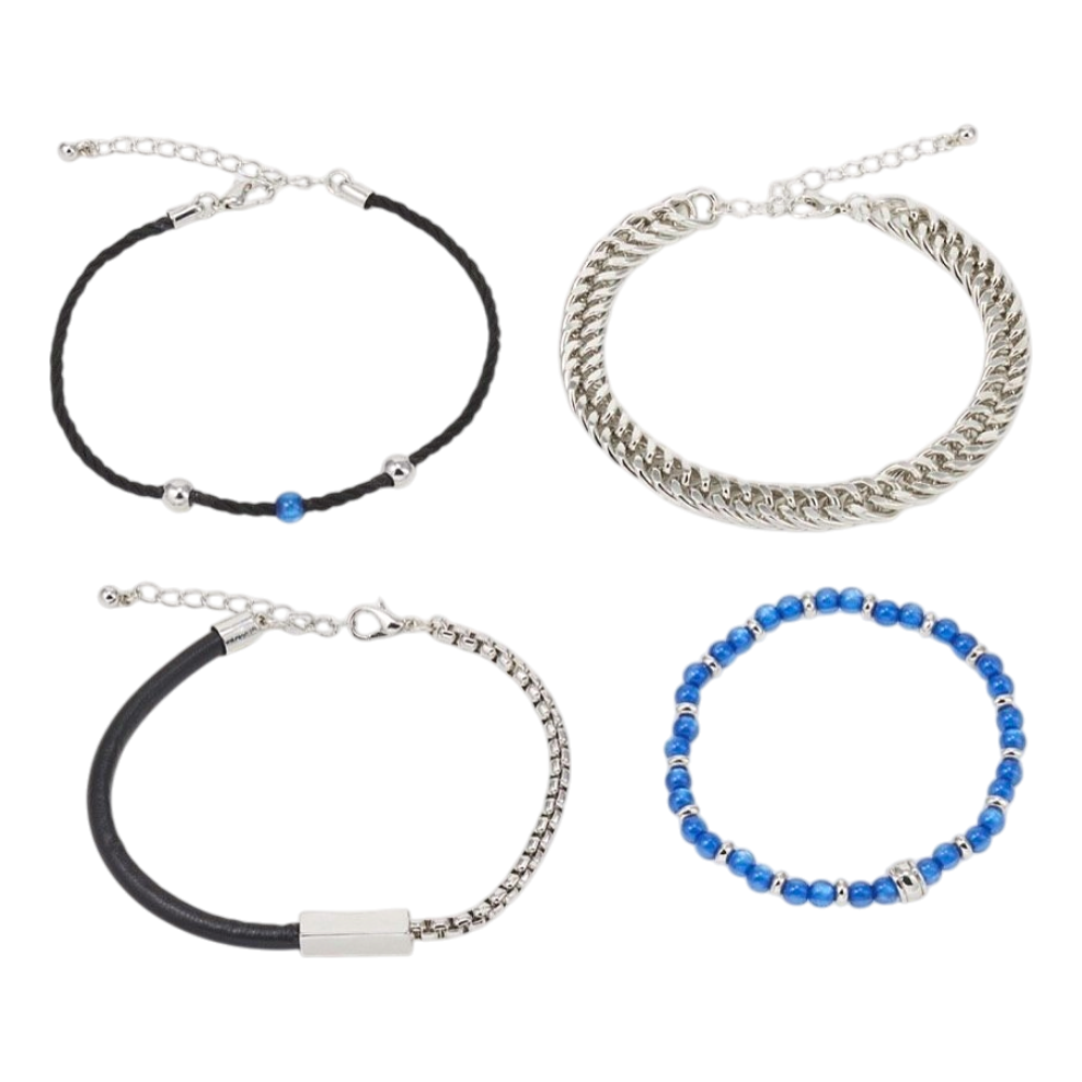 A set of four assorted bracelets featuring a mix of silver-tone chains, black cord, and blue beads.