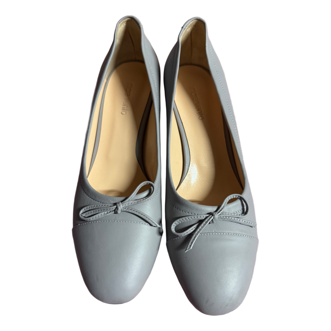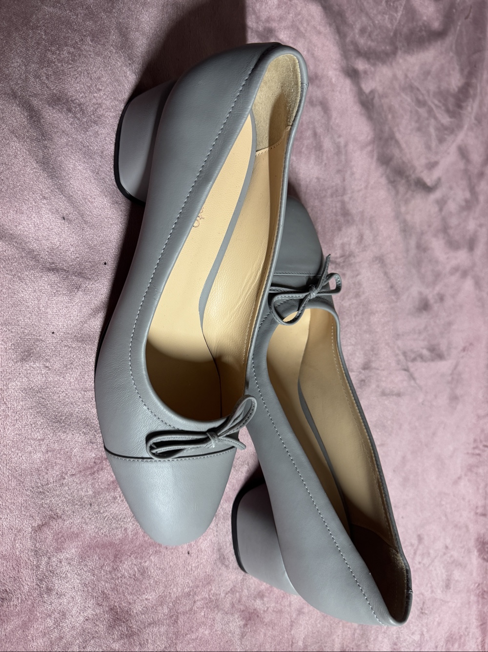Grey leather block heels with a decorative bow detail on the front. Classic rounded toe design.