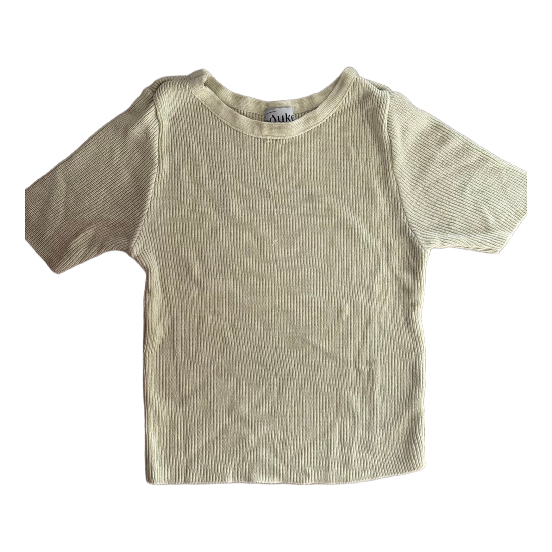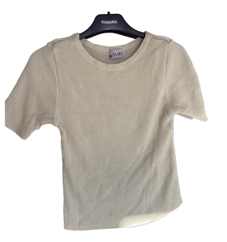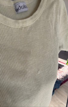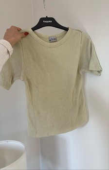 The color is a really pale green (mint?). There have probably been buttons at the front center once. I have worn it as size S, I am 163 cm tall.