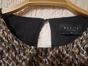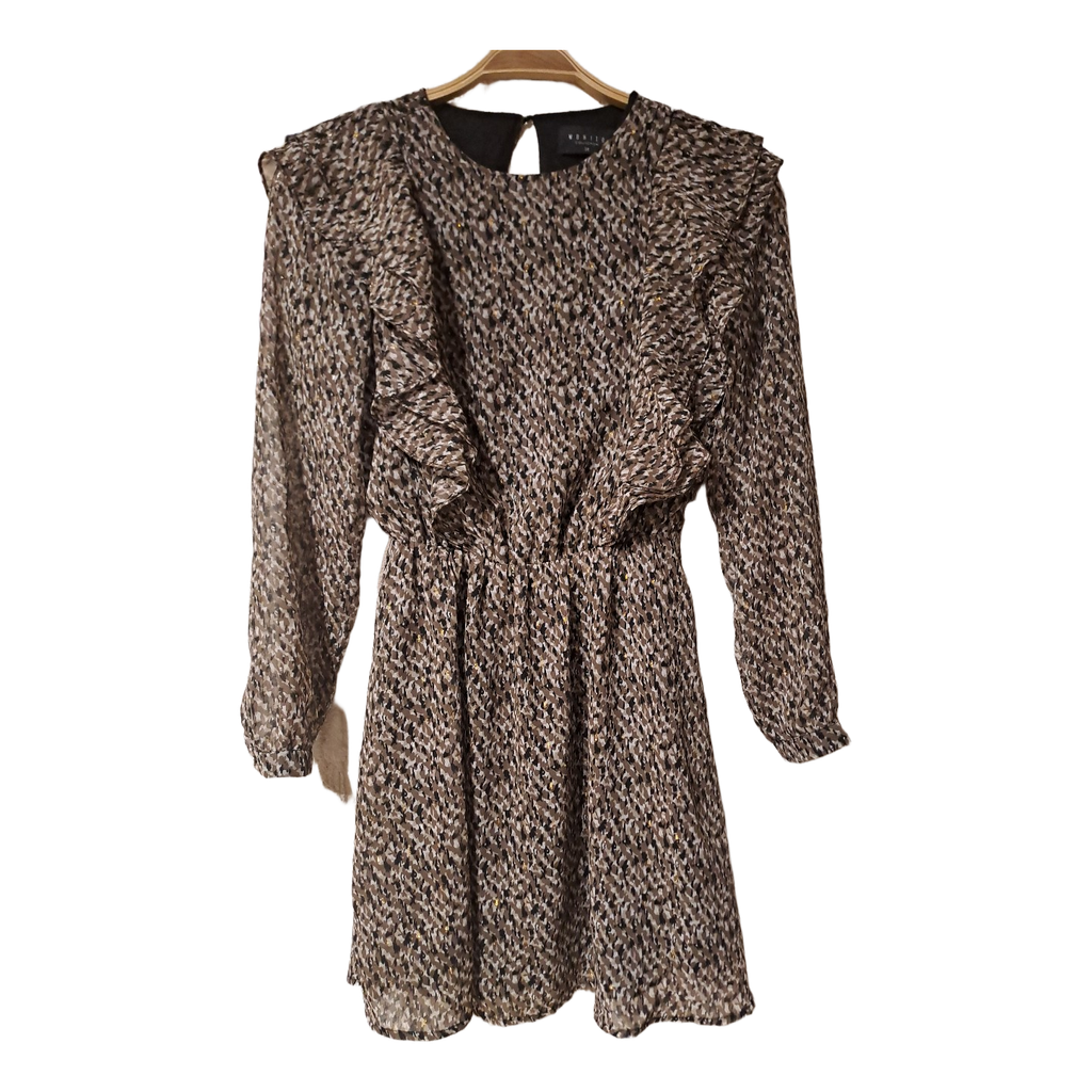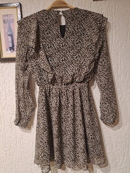 Mini dress with long sleeves and frill details. Features a multi-colored abstract pattern and a small back cutout. Size 34.