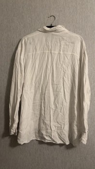 White long-sleeved shirt with a classic collar and single chest pocket. Button-down front closure.