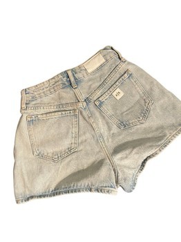 Light blue denim shorts with a high-waisted fit. Features five pockets and a button closure. Brand tag visible inside the waistband.