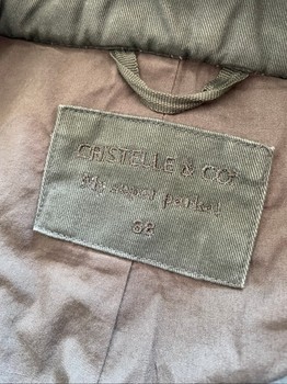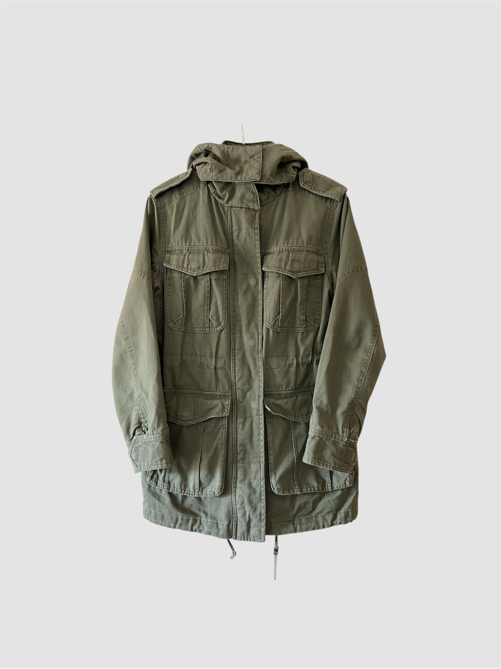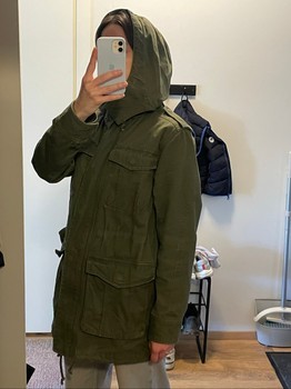 Green parka with a hood and four front pockets. Made of cotton with a polyester sleeve lining. Size 38.