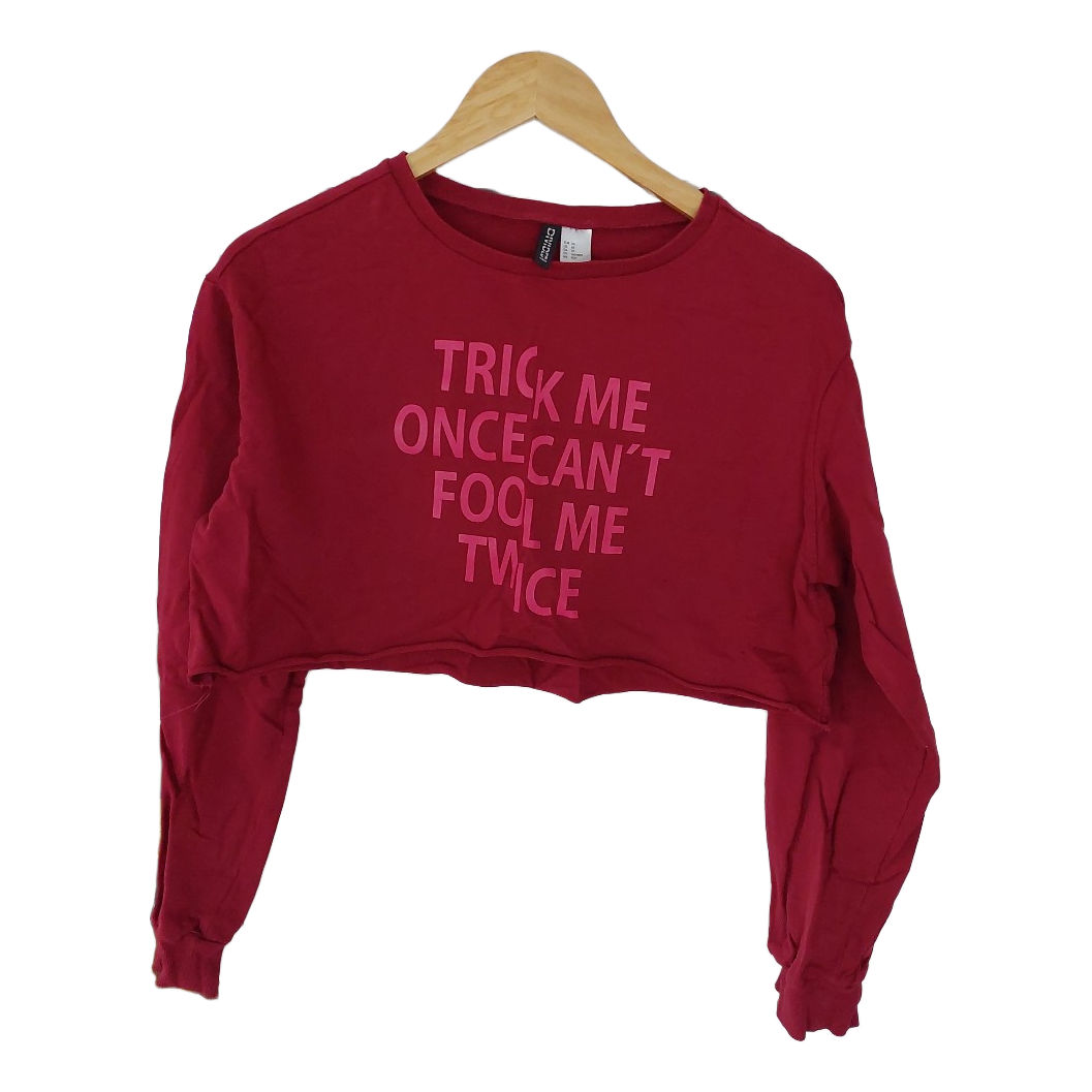 Red long-sleeved cropped sweatshirt with graphic lettering on the front.