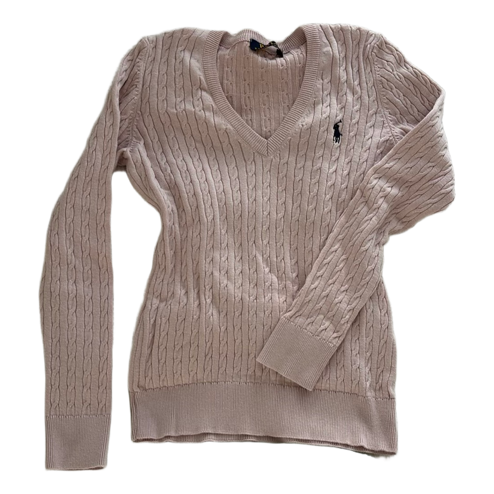 Light pink cable-knitted V-neck sweater. Long-sleeved.
