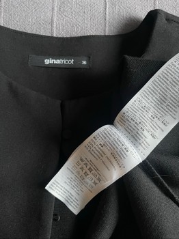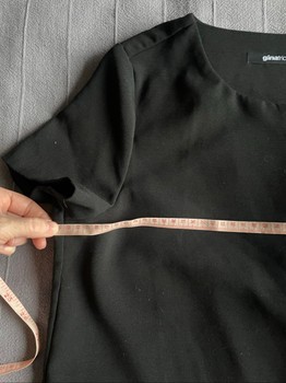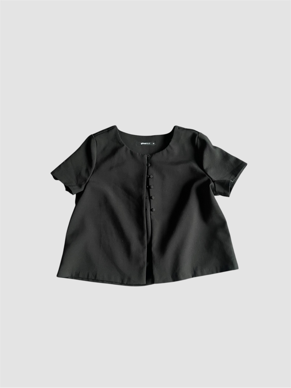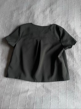 Black short-sleeved top with a button front closure. Features a round neckline and pleated detail on the back. Size 36.