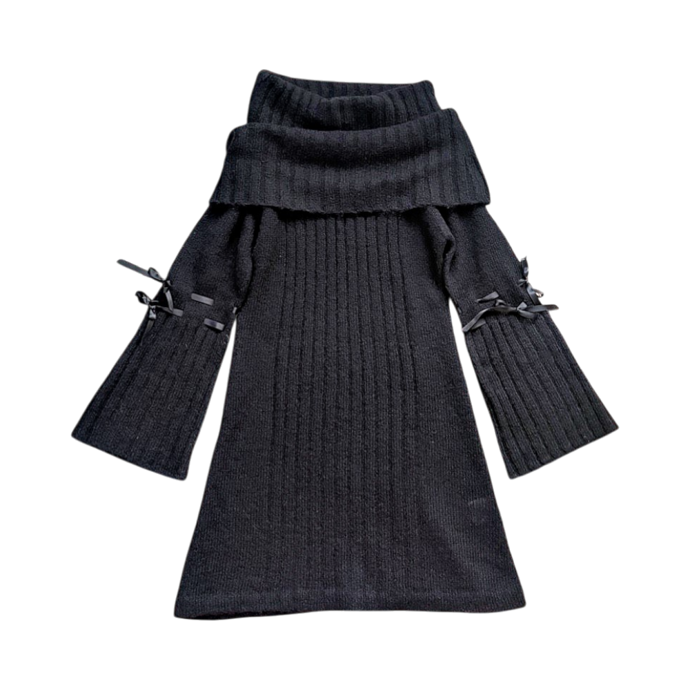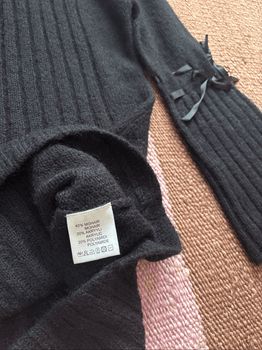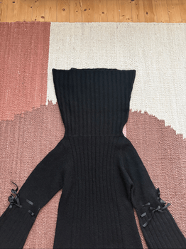 Black short wool dress from Marimekko's old collection, apparently from the early 2000s. Large foldable off-shoulder collar, cute bow ribbons on the sleeves. Karlsson-Marimekko collection. The dress has no lining so the fabric is a little sheer. No size label but fits approx size S; shoulder-to-hem approx 87 cm and armpit-to-armpit approx 47 cm.