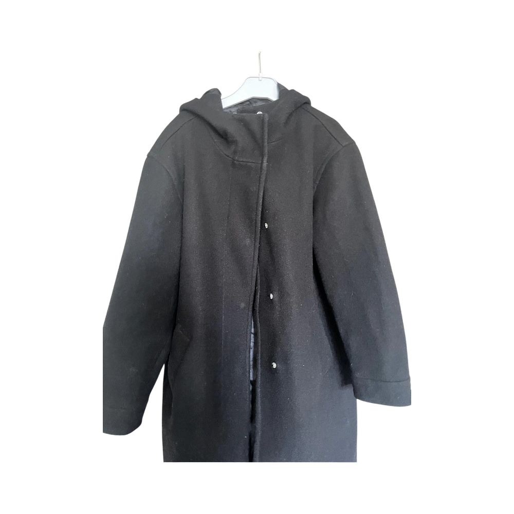 Coat featuring a black color with a hood. Includes snap closures and two front pockets for convenience.
