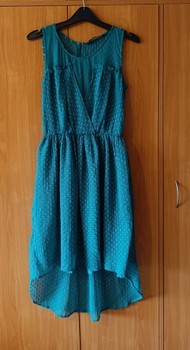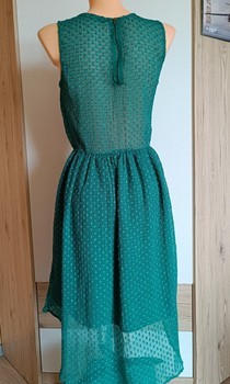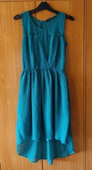 Emerald sleeveless dress with a textured dot pattern and a high-low hem. Features a back zipper closure. Size S.