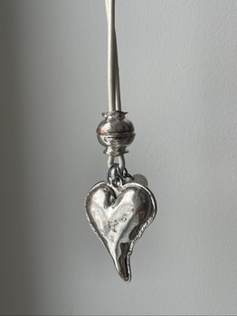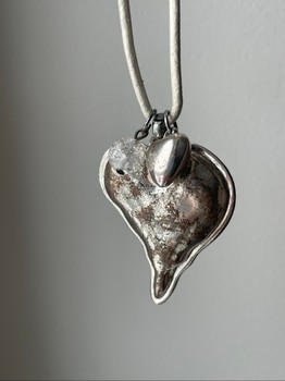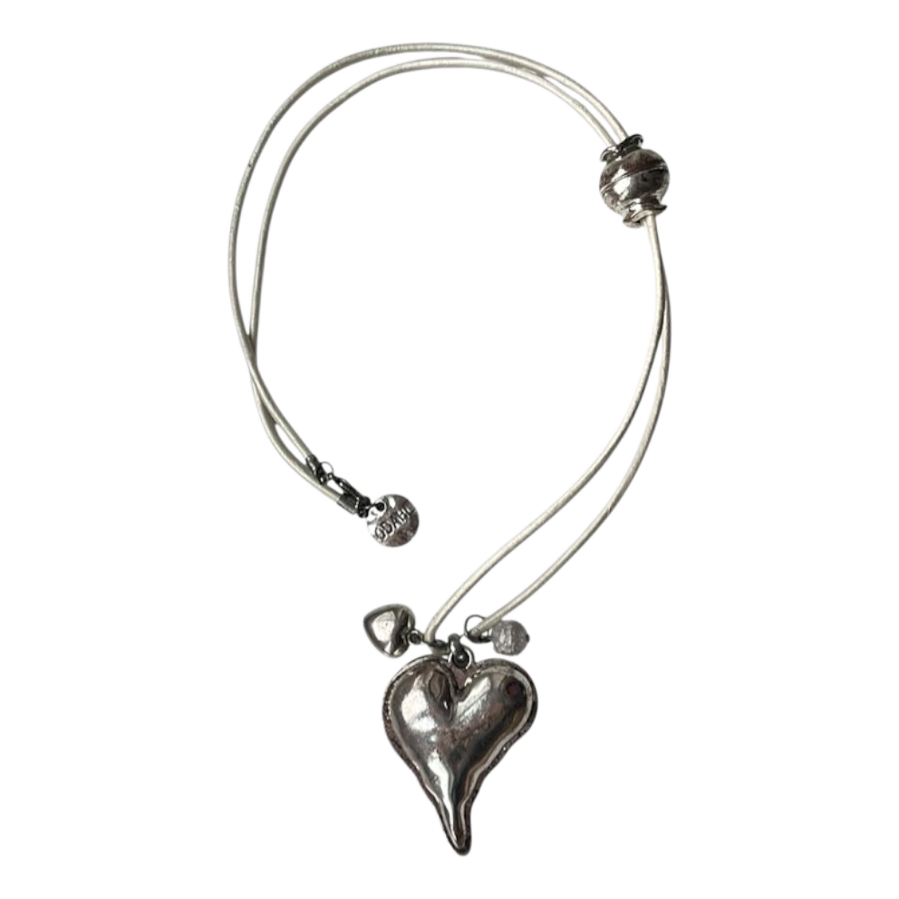 Silver-toned heart pendant on a light-colored cord. The large pendant has a textured surface and is accompanied by smaller heart and clear bead accents.